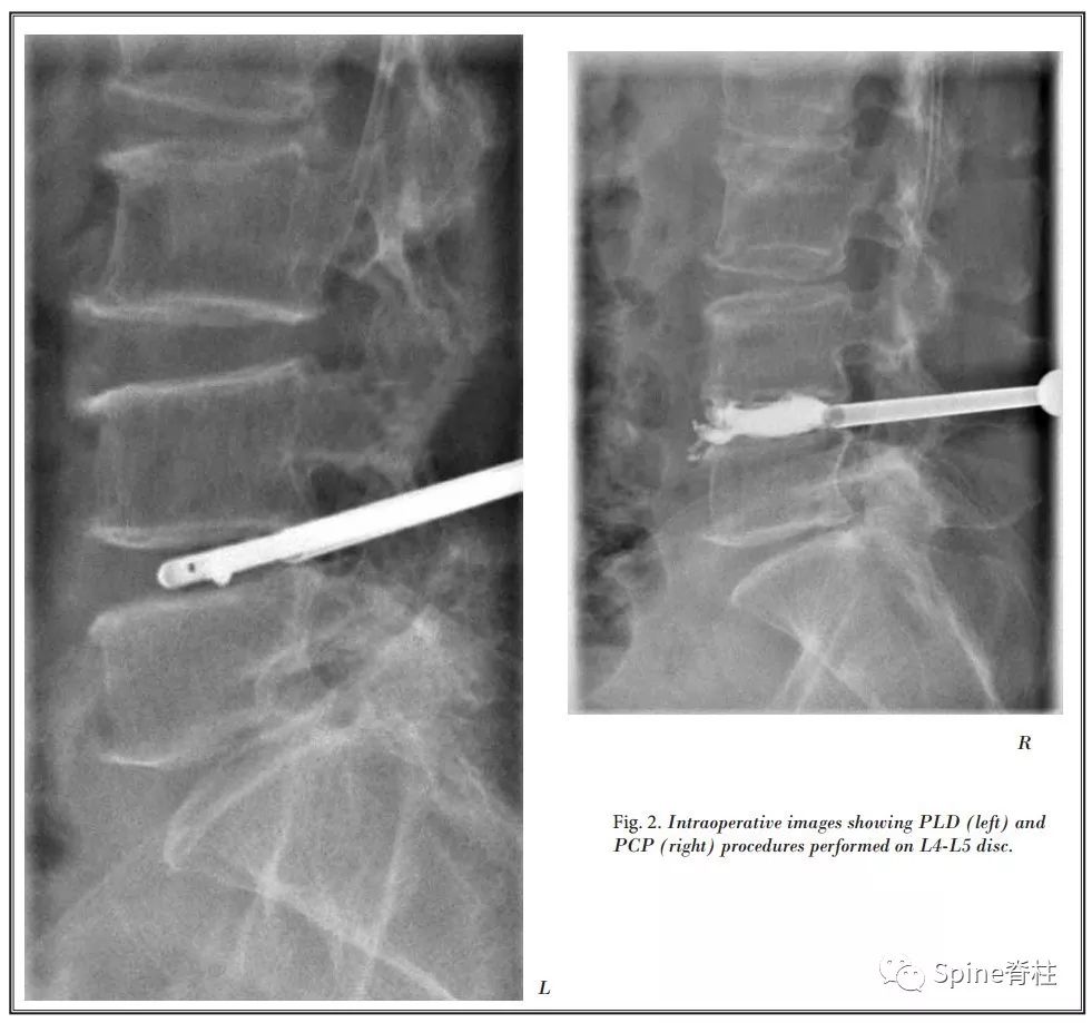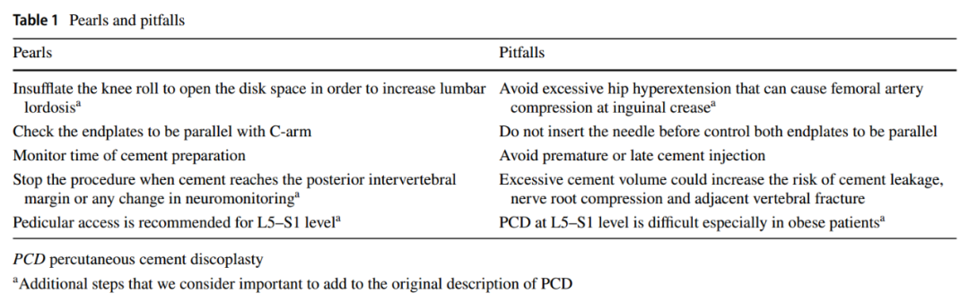 “During a vertebroplasty procedure, the authors observed that the adjacent disc with vacuum phenomenon filled with PMMA, and signs of instability had disappeared on postoperative X-ray. This led to the development of the PCD procedure: PMMA augmentation of the intervertebral disc with vacuum phenomenon in patients otherwise not suitable for more invasive surgery. The hypothesis of the authors is that, by filling disc space with PMMA, instability is decreased, thus reducing in turn pain and disability”. “在椎体成形过程中,骨水泥渗漏至邻近伴真空征的椎间盘内,但术后复查却发现术前的椎体不稳现象居然消失了”。这给作者带来灵感,提出PCD手术:即将PMMA骨水泥注入伴真空征的椎间盘内。