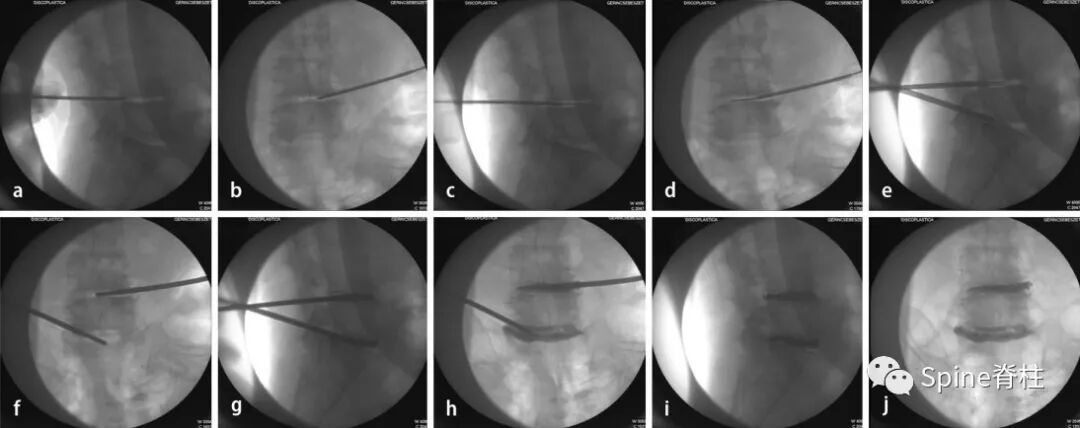 图: PCD术中图像a: 向椎间盘间隙插入Jamshidi 针; b: 针在正位时的位置; c,d: 将K-wire 插入Jamshidi针内; e,f: 插入椎体成形术套管针; g,h:PMMA骨水泥填充椎间盘; i,j: 术后情况