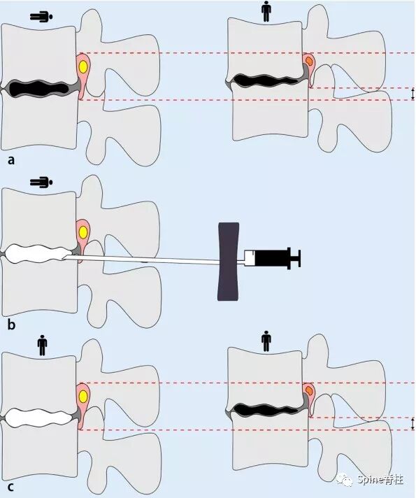 图: 垂直不稳和PCD概念a: 站立时,在负荷作用下,有效椎间孔面积小于俯卧位(无负荷);站着时,神经根受到压迫可导致下肢痛。b: PCD:在俯卧位,“真空”的椎间盘充满PMMA。c: 椎间盘成形术后,椎间盘高度保持不变,椎间孔横截面积较术前明显增大