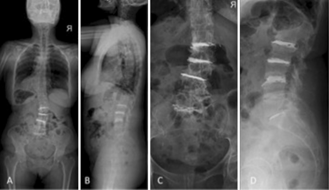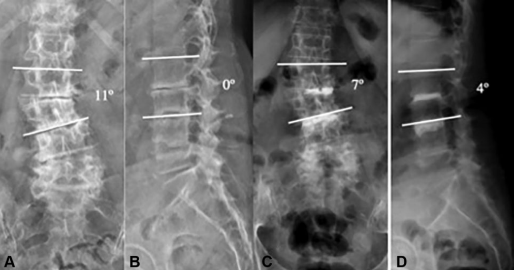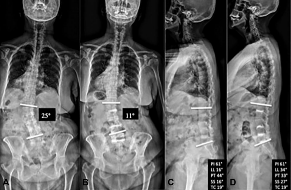 图: 与典型病例相似的另一退变性侧凸患者,术前存在手风琴现象,经多节段PCD术后冠状位得到10°的纠正且恢复部分腰椎前凸