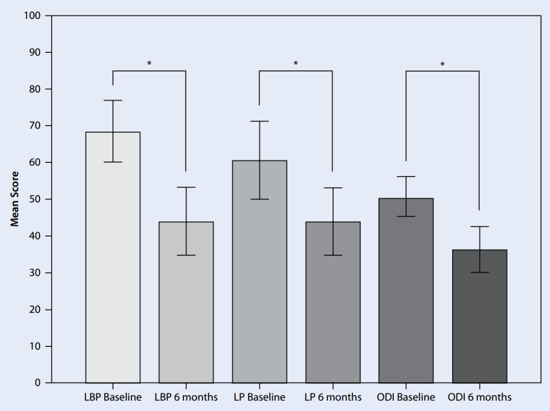 图:手术前和6个月随访时,ODI和腰痛、腿痛VAS评分情况