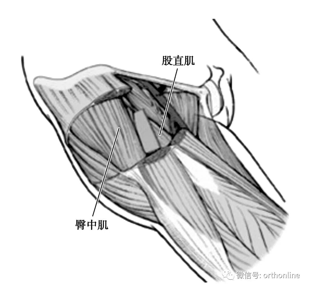 牵开缝匠肌和阔筋膜张肌后即可显露深面的股直肌和臀中肌。股直肌直头起自髂前上棘,返折头起自髋臼上缘及关节囊,自髂前上棘下1cm处切断股直肌直头,自髋臼上缘切断股直肌返折头,向远侧翻转股直肌,向外侧牵开臀中肌,显露髋关节囊,向内侧牵开位于关节囊内下方的髂腰肌,于骨膜下剥离髂骨前外侧的肌肉,显露髋关节囊,于髋臼盂唇的外侧纵行或者T形切开关节囊,显露股骨头、股骨颈及髋臼前上缘。