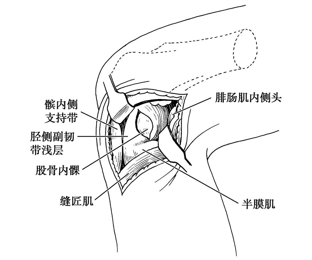 沿缝匠肌前缘自其胫骨止点处向近侧至关节线上5cm处切开其筋膜,屈膝使缝匠肌后移,显露其深面的半腱肌及股薄肌,将鹅足三肌牵向后方可显露胫侧副韧带胫骨止点(图11)。