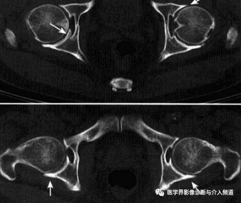 2、CT:急性期关节积液、周围软组织肿胀,关节间隙增宽,可合并骨折,继发性退行性骨关节病可出现髋关节间隙变窄,骨性关节面毛糙,边缘骨质增生,游离体,关节囊及周围软组织钙化或骨化影。