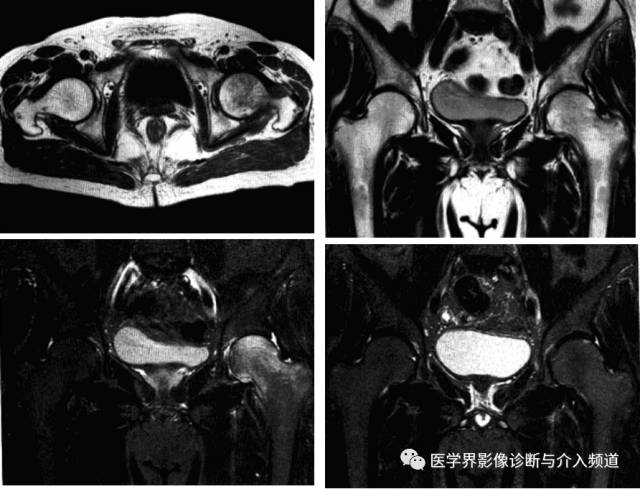 3、MRI:髂关节积液,关节囊肿胀,无股骨头及髋臼破坏征象。(本病诊断最佳检查手段。)