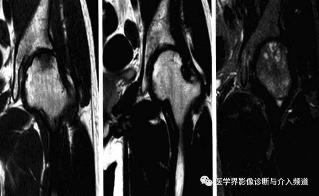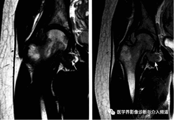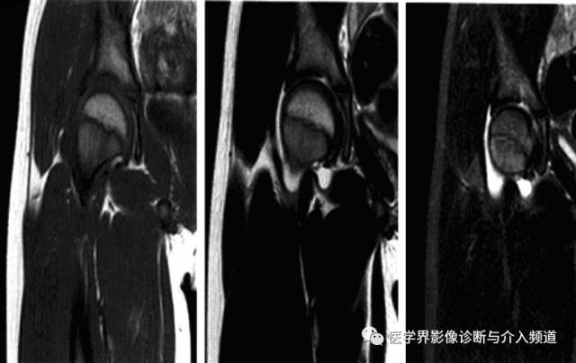 2、MRI:骨头至转子间在T1WI低信号,T2WI及脂肪抑制像呈均匀一致高信号,无局灶性改变,多伴髋关节积液,周围肌肉层次清晰,随访多于6-10个月内恢复正常,无后遗症。