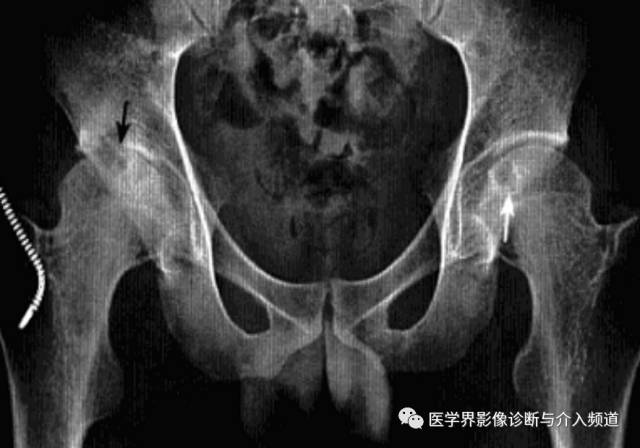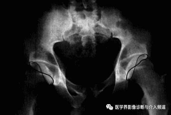 影像诊断:X线平片是基本检查方法,直立骨盆正位及髋关节侧位片。
