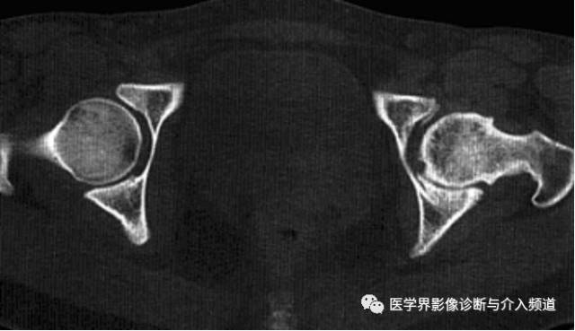 CT:三维CT可测量股骨头颈连接处前外侧偏移量减低,股骨头颈联合处前上缘可见骨性突起。