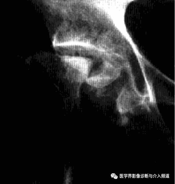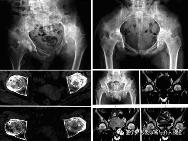 2、CT:早期髋关节积液,周围软组织水肿;随病情进展,骨端增生硬化,边缘骨赘形成,游离体;后期,骨端崩解,关节正常结构破坏,关节腔大量坏死骨块和钙化的软骨碎屑,周围软组织骨化、钙化,增强显示关节囊及滑膜囊明显强化、呈绒毛状突向关节腔。