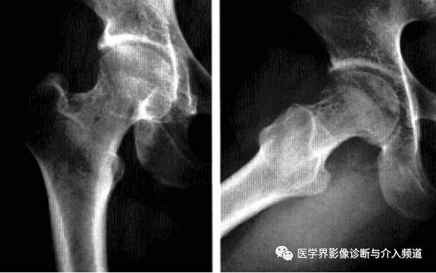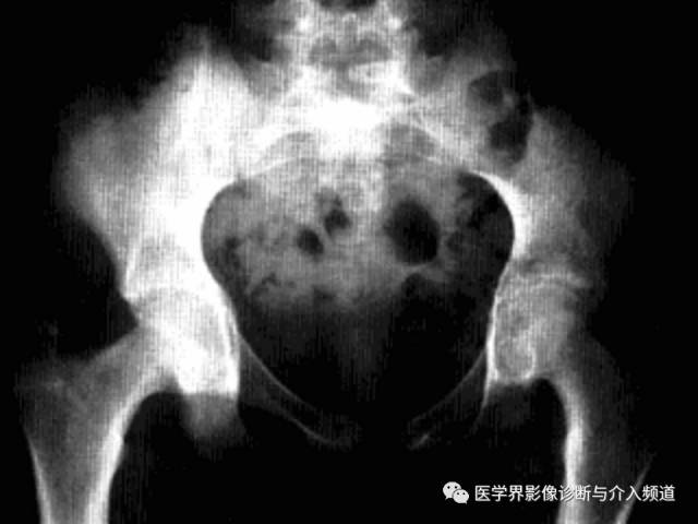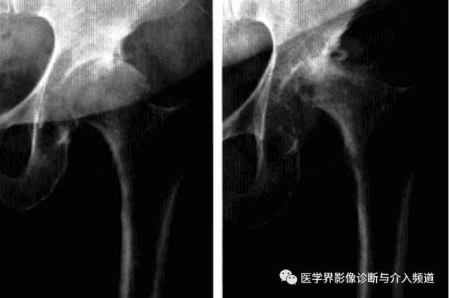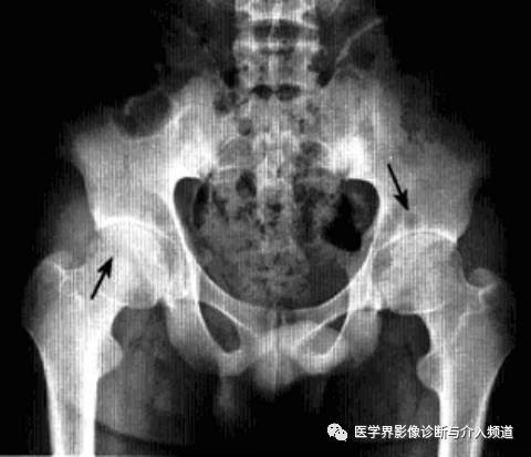 1、平片:活动期表现骨质疏松,股骨头和转子间弥漫性骨密度减低,股骨头软骨下骨皮质吸收,髋臼受累程度轻,无骨侵蚀或破坏,关节间隙保持正常。