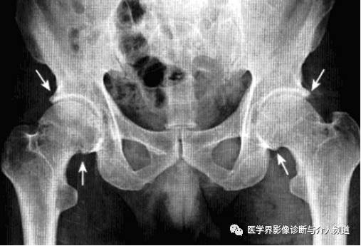 1、平片:早期关节内积液、软组织肿胀、关节间隙增宽;进展期股骨头关节面变平、关节内游离体,关节旁钙化及骨化,关节脱位;晚期骨端破坏、大量骨赘形成,反应性骨膜增生。