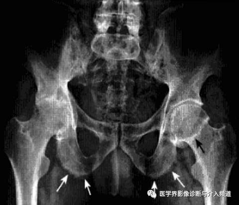 1、平片:双侧对称受累,早期骨质疏松,关节囊膨隆,股骨头及髋臼骨质侵蚀糜烂;中期关节间隙一致性狭窄,软骨下囊性变,关节面边缘骨质增生,坐骨结节、坐骨耻骨支及股骨大转子可伴骨膜炎;晚期股骨头内移、髋臼内突,关节腔闭锁呈骨性强直。
