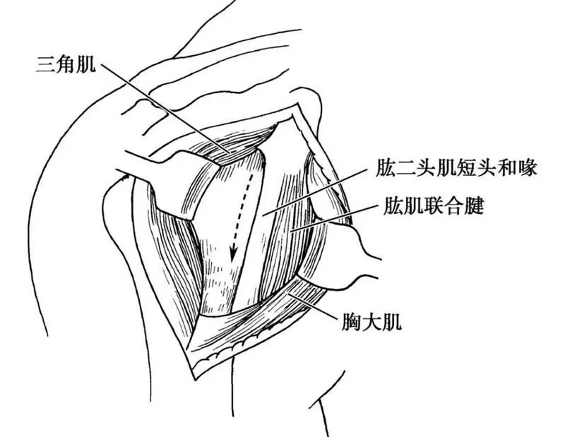 沿肌间沟继续分离,注意保护头静脉。分别向内、外侧牵开胸大肌、三角肌,显露肱二头肌短头和喙肱肌联合腱(图5)。
