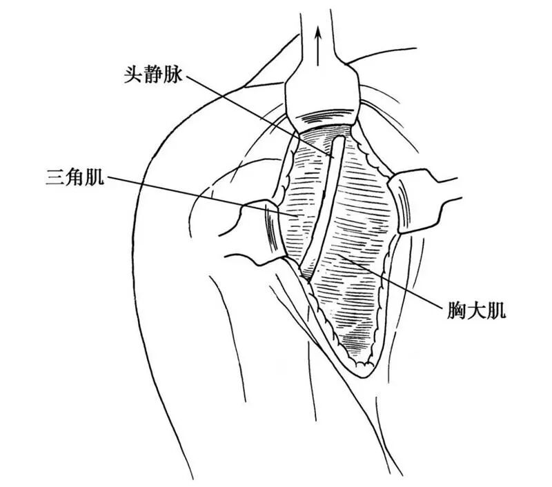 图4 向两侧牵开皮瓣即可显露头静脉和三角肌胸大肌间沟