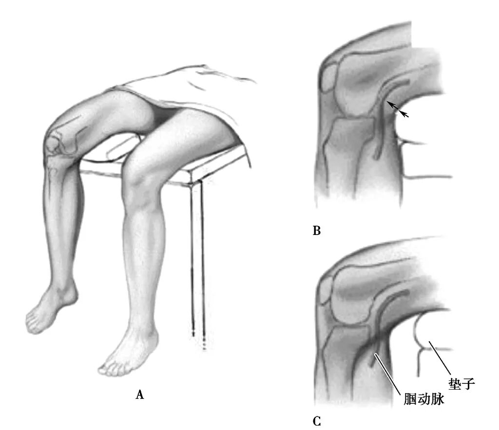 患者取仰卧位,患肢大腿根部绑气囊止血带,小腿悬于手术台外,患肢大腿垫高,膝关节屈曲位(图6)。