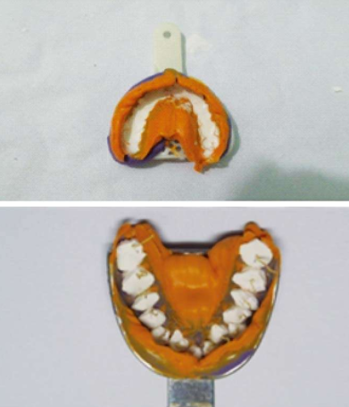稳住托盘待材料硬固,由于终印模与口腔软组织紧密贴合,边缘封闭好,吸附力大,如果印模取下有困难不可强外力使印模脱位,可想法使空气进人上颌后缘,让患者含漱或鼓气,从唇侧边缘滴水,取下印模,灌两副模型(准备锯一副,留一副,比对树脂定位)。