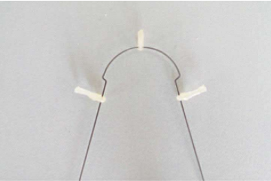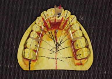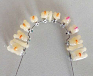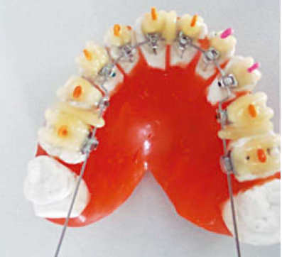 7、确认弓丝平整无转矩之后将连带托槽的整根丝固定到石膏模型上,弓丝水平向位置参照本节所述步骤。