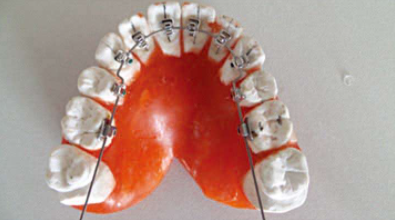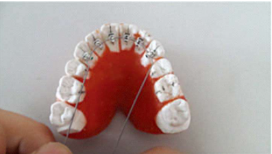 5、使用0.025″×0.018″全尺寸弓丝,先弯制前牙3-3的弧形。(图9中钳子为专用的舌侧弓丝成型钳)为了预留托槽和石膏牙间的距离,我们先将前牙段放置托槽。用结扎圈将托槽和弓丝结扎。