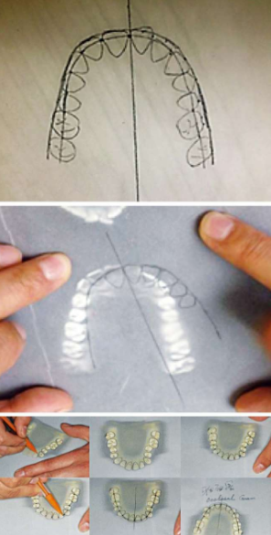 在纸上复印原始模型,在硫酸纸上画出每颗牙颌面形态,画出理想接触点连线,每个接触点绘出理想弓形图并画出中线,5-5的位置向外平行2mm,6-7的位置向外平行3mm。复制最外缘连线,把每颗牙画在理想弓形图内,要求牙齿颌面的颊舌向最边缘长轴与连线垂直。绘制颌面图的意义,是作为排牙试验完成结果核对的模板,保存了个性化牙弓形态、宽度。排牙时牙弓形态参照理想弓形图。