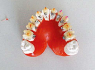 10、使用树脂定位夹,即托槽槽沟和托槽结扎翼填蜡,树脂堆积高度,修整形态,托槽背面树脂打磨固位沟,结扎圈固定,标记牙位放置结扎圈。