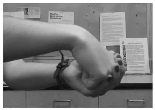 (1)初级:坐位或站立位,肘关节伸直且掌心朝下,保持此姿势,将腕关节向外侧偏并屈曲腕关节,另一只手对手背施加一个持续性的按压。
