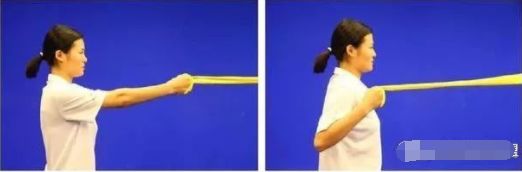 【初级动作】站立位。将弹力带一端系在一个稳定的固体物上,健侧靠近固定物。患手握住弹力带另一端,上臂贴紧身体,肘关节屈曲90度,前臂与地面平行。拉伸弹力带远离固定点,缓慢回到到初始位置。