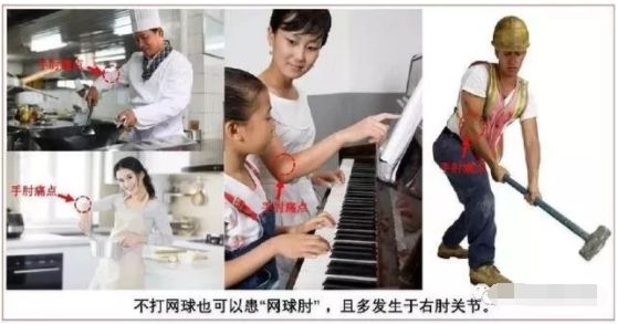 如家庭主妇、理发师、操作电脑者、钢琴演奏员、小提琴手、打字员、建筑工人、泥瓦匠、石匠、钳工等均是“网球肘”的高发人群,而且好发于右手。