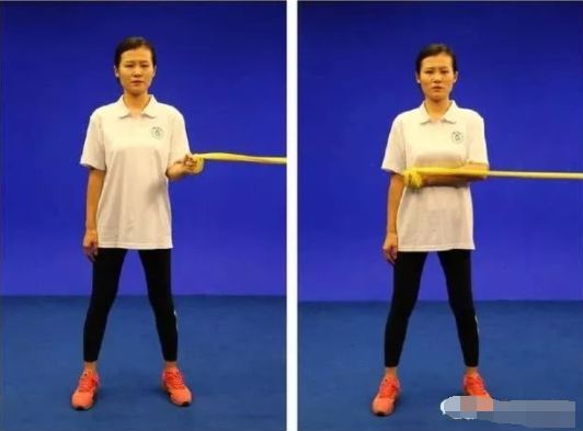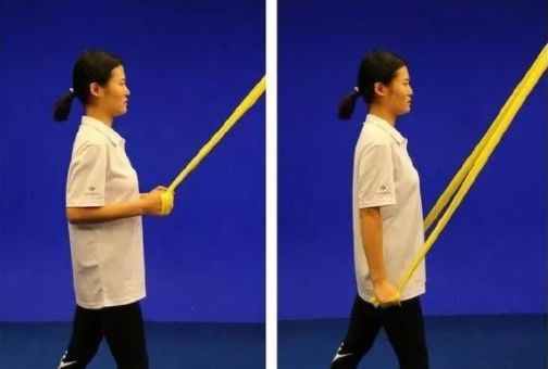【初级动作】站立位,将弹力带一端系在一个稳定的固体物上,患侧靠近固定物。患手握住弹力带另一端,上臂贴紧身体,肘关节屈曲90度,前臂与地面平行。拉伸弹力带远离固定点,缓慢回到到初始位置。