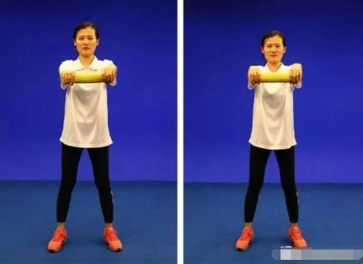 【初级动作】站立位,将弹力带中部系在一个稳定的固体物上,固定点高于头部。肘关节屈曲,双手抓住弹力带两端,伸直肘关节。