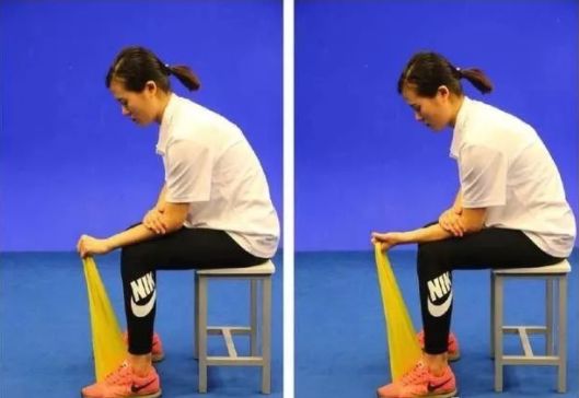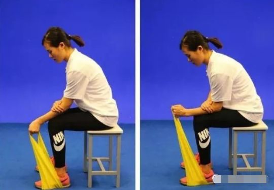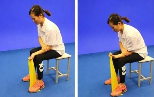 【初级动作】坐在凳子上,一脚踩住弹力带的两端,健手固定患手前臂于大腿上。患手抓住弹力带,腕关节在无痛范围内,做屈伸运动。屈伸肌训练交替进行。
