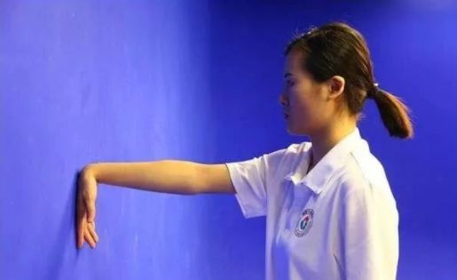 (2)中级:站立位,肘关节伸直,掌心朝下,手背顶住墙壁,保持此姿势,通过挤压墙壁,使腕关节获得一次持续的牵伸。