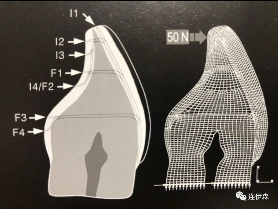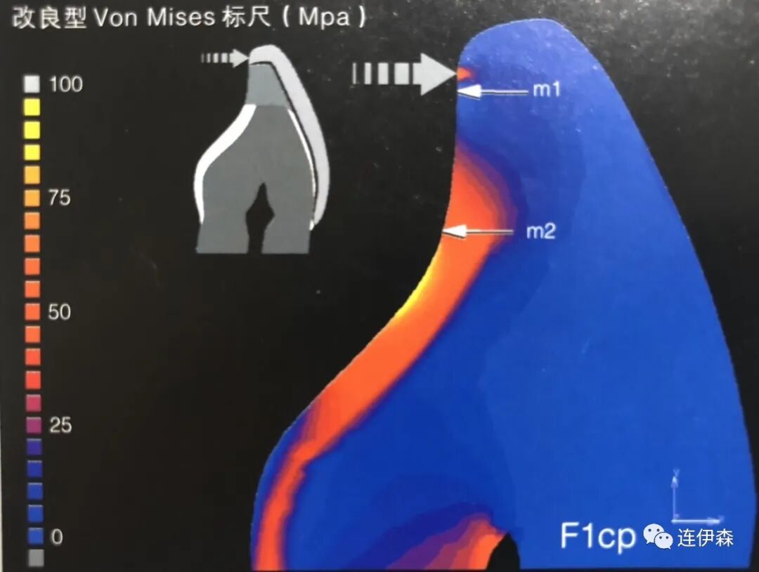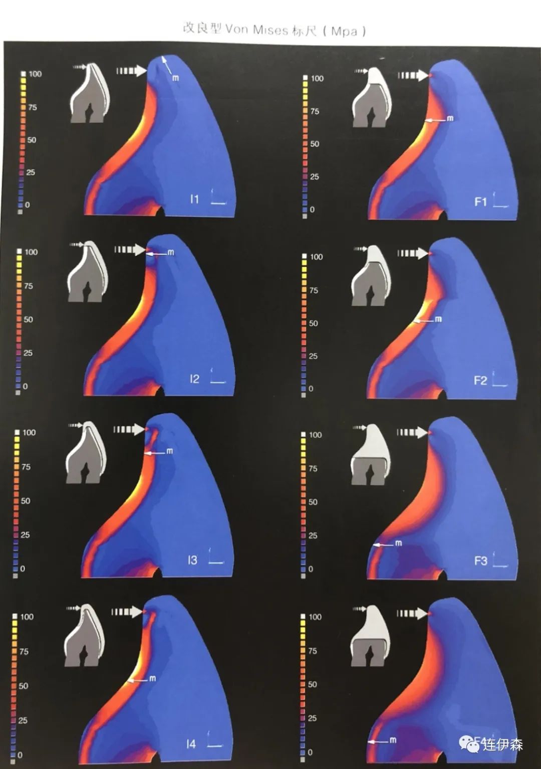 右侧图示:F1的边缘位置不是最佳但可以接受,F2边缘位置很差,舌侧窝的应力超过100MPa,F3和F4的边缘设计和位置都很好,牙-修复体界面和修复体自身都不会产生过高的应力。