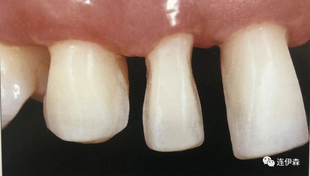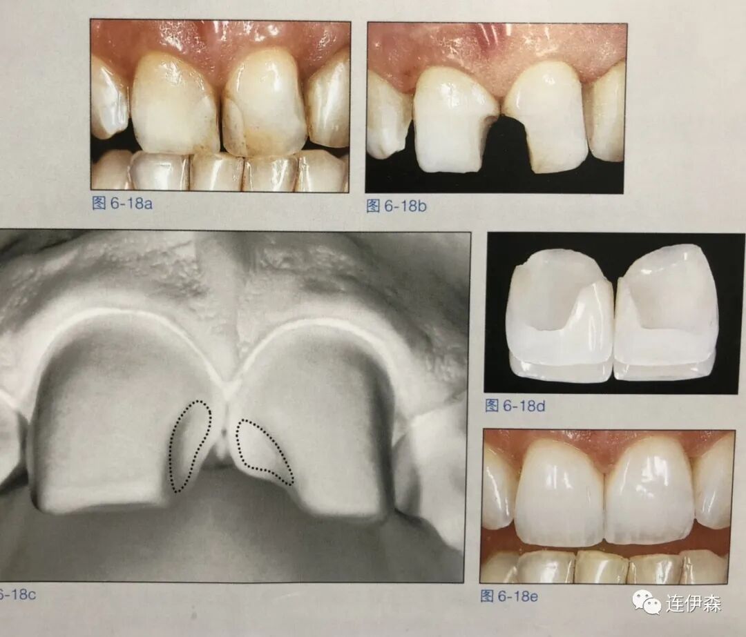 较大范围的牙体组织缺损(较大的IV类洞)只需要瓷贴面就可以修复,修复前用树脂对牙冠外形重建并不能提高牙-修复体复合体的强度,但可以增加弹性。但是要避免以瓷贴面覆盖大量的树脂,因为树脂存在聚合收缩,有的还有较高的热膨胀性。