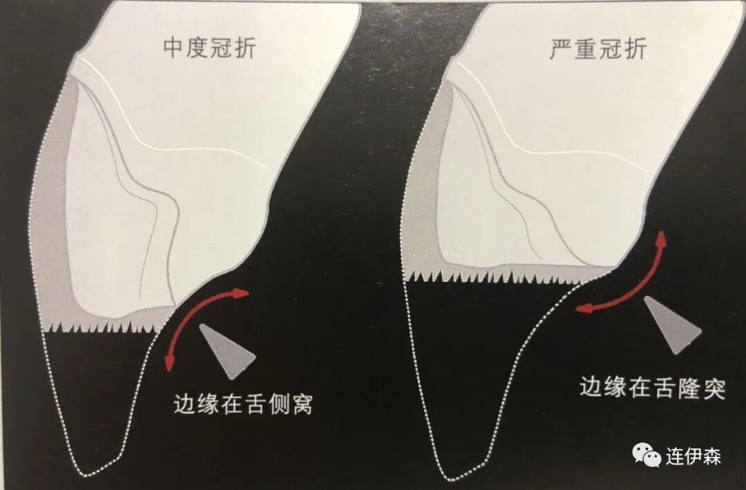 3.当重度冠折(切2/3)时舌侧边缘位于舌隆突区(F3、F4),由于舌隆突光滑的凸度,对接边缘或包绕都不会产生不利的应力。所以重度冠折的设计并不比中度冠折复杂,由于应力在瓷表面重新分布,修复体在舌侧窝所受应力较小
