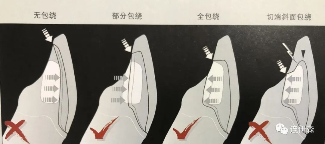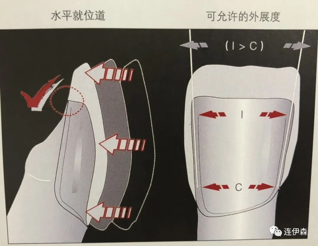 1.当轻度冠折或磨耗时,瓷修复体的舌侧边缘可以位于上图中I1、I2、I3位置,此时可以设计为开窗式、对接式或浅包绕式。能有效地保护修复体边缘、避免舌侧窝受到有害的拉应力。应该尽量避免舌侧包绕延伸进入舌侧窝内,因为这种设计会将薄弱的瓷边缘置于拉应力较大的区域。