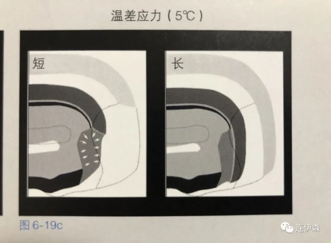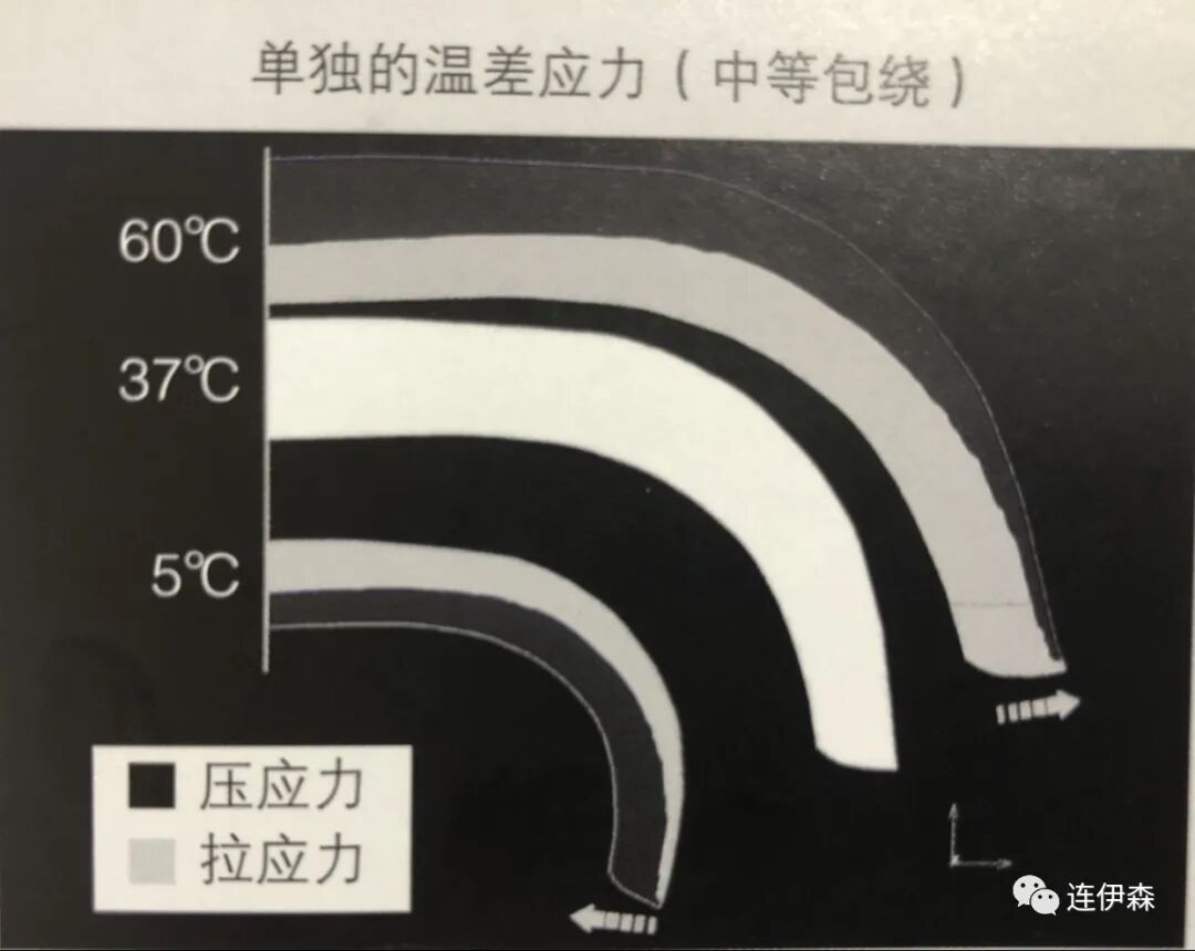 上图为中度包绕的贴面受到温差应力的示意图,白色区域代表37℃时的原始形态(基线),示意图将温差导致的形变放大500倍,虚线箭头指示为充填体边缘的相对移位。