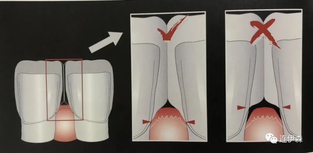 关闭黑三角的设计原则与关闭牙间隙相似。下图显示了所有关闭所有微小间隙时的特殊要求:设计龈下边缘以利于制作渐进性的邻面凸度和外形
