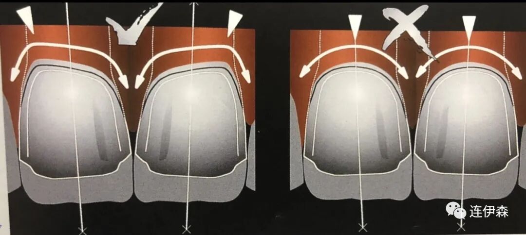 牙体预备设计龈缘位置时应考虑到牙龈外形的根方最高点通常位于牙轴的远中,对称性扇贝状的设计显得不自然。