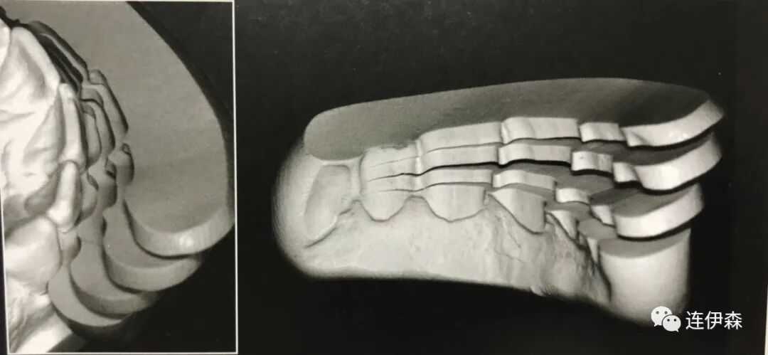 控制牙体不同水平(从切缘到切端)上的预备间隙是非常重要的。这可以按照”笔记本法“横切硅橡胶导板来完成,就像制作连续的多层指示片。
