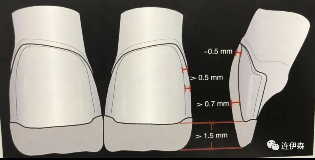 (连:其实这个数值不绝对,要根据基牙颜色和目标色、材料以及技师水平而定,建议多与技师沟通,在预备前与技师确认需要的空间再开始预备)