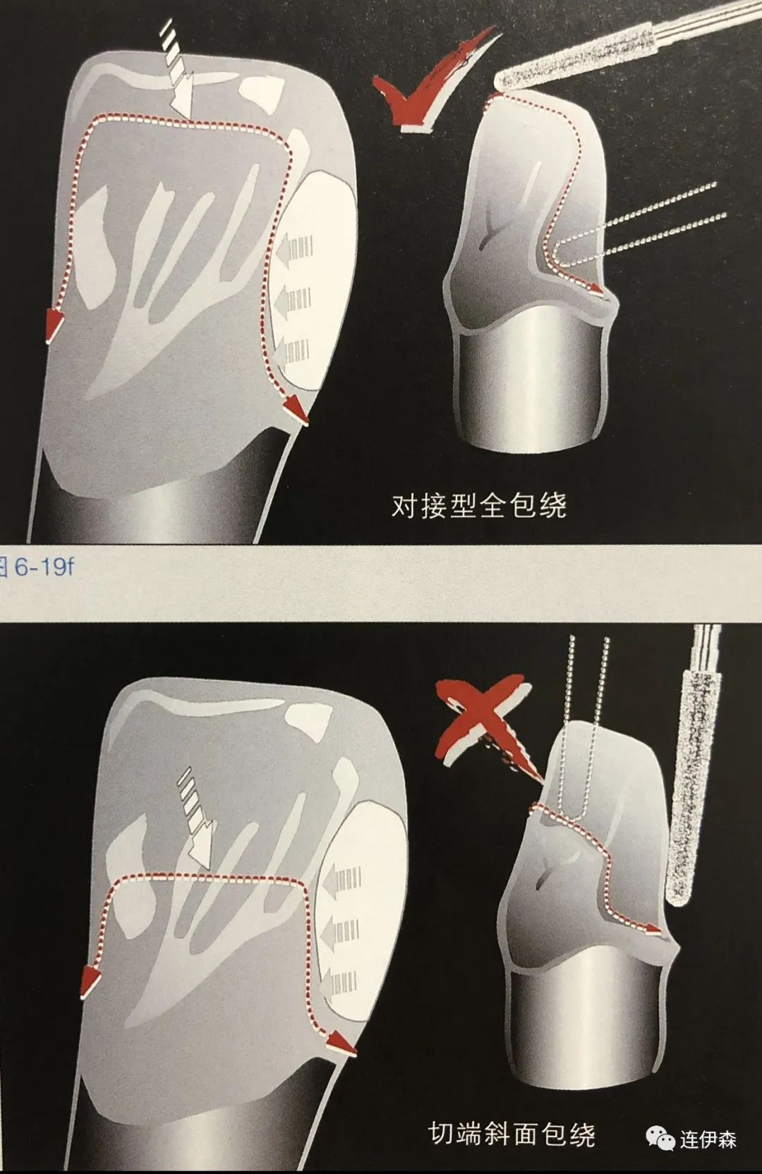 唇侧预备时应使车针可以与牙体长轴平行,但在预备邻面和切端的时候应该使车针成水平方向进行预备,如果一味地沿牙体长轴方向预备,极有可能形成倒凹和牙体舌侧的过度预备。