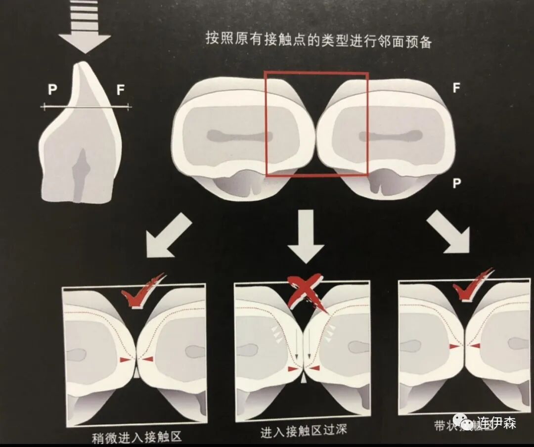 如上图所示,如果邻牙接触面积较小,终止区的可以稍微越过接触点,尽量保守预备。