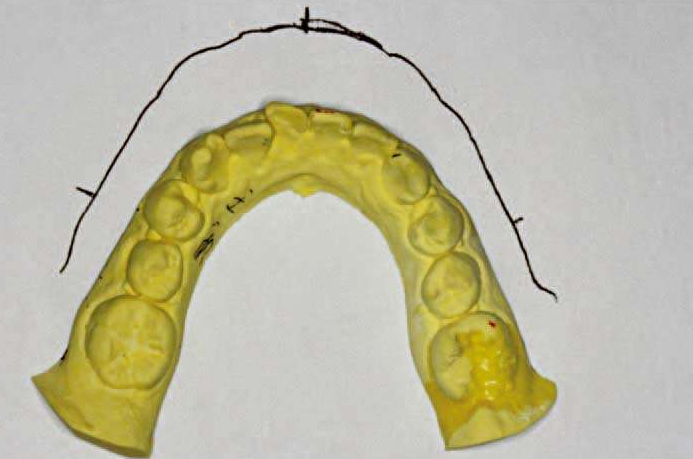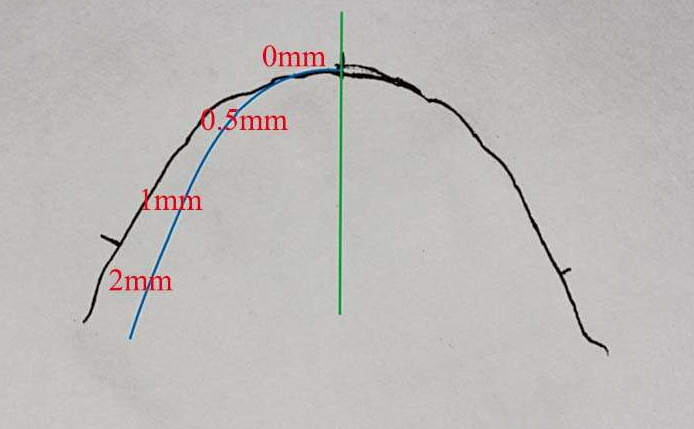 3.将这条wala嵴的黑线标记在纸上。用分界线区分牙位得到下面弧线。