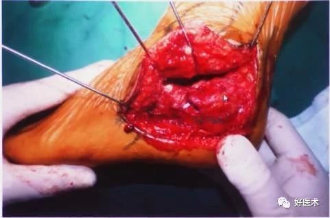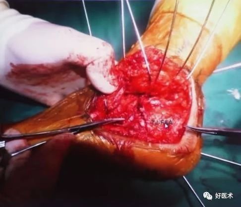 显露关节囊后面,切断尽量挨着后面(蓝色箭头处)切断,不要挨着跟腱(黄色箭头处)切开,这样会使留下来的骨膜有比较好的血液供应。