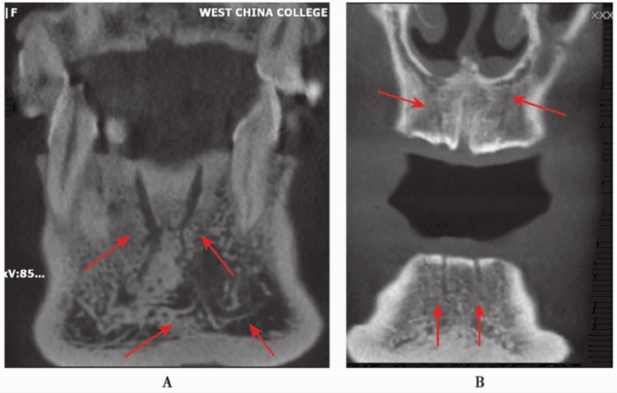 图5 CBCT冠状位A.下颌骨前牙区的粗大血管影像;B.上、下颌骨前牙区的血管影像
