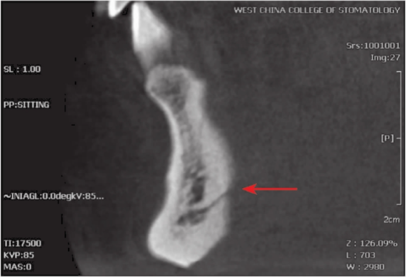 图7 CBCT矢状位显示下颌骨前牙区的舌侧开口