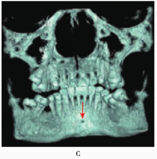 A.矢状位下颌骨下颌正中管;B.冠状位下颌骨下颌正中管;C.舌侧三维重建下颌正中管影像