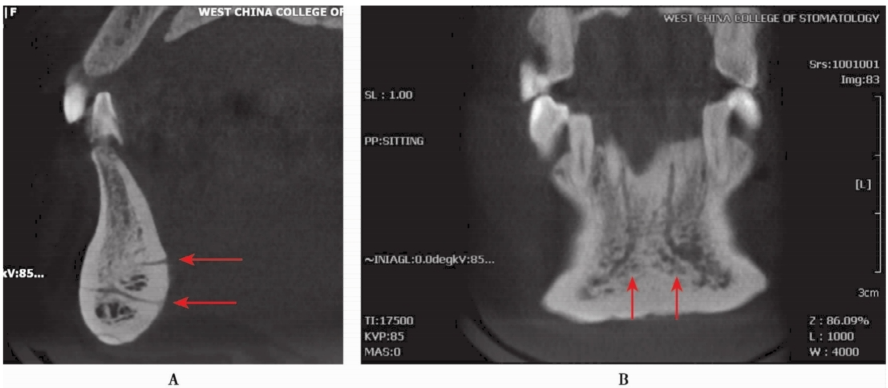 图6 CBCT矢状位及冠状位显示下颌骨前牙区的粗大的血管及走行方向