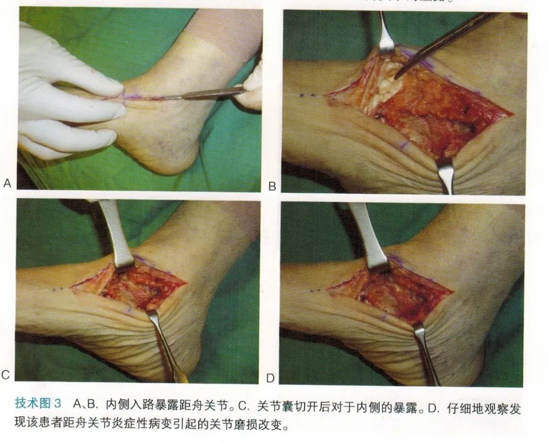 纵行切开关节囊(技术图3C、D)。