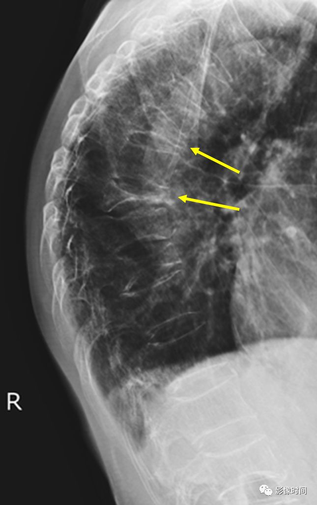 病例 2,老年性骨质疏松,多发压缩性骨折。胸椎侧位 X 线片示例多发椎体楔形变扁,两个椎体呈扁平椎/硬币征改变(黄箭)。